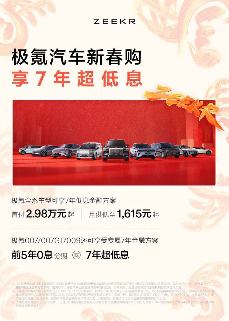 2月1日,極氪發(fā)布了1月交付成績單,同比勁增99.7%,在車市普遍遇冷的背景下,這一亮眼成績不僅為高端豪華車市場注入強(qiáng)勁信心,更印證了用戶對極氪的深度認(rèn)可。臨近春節(jié),為回饋用戶支持,極氪發(fā)布了新春購專屬政策,全系車型可享7年超低息金融方案,助力更多消費(fèi)者以超低門檻解鎖新能源豪華體驗(yàn)。此次極氪推出的政策有四大特色?!ひ皇钦叩莫?dú)家性,極氪首推“7年貸款,前5年免息”(簡稱“7免5”)“7年0.5%超低息”“5年零息”等多種選擇方案,大幅提高了用戶購車決策的靈活度?!ざ怯秀y行合作的保障,極氪新春購專屬政策與國有銀行、大型綜合性銀行直接合作,屬于行業(yè)高水準(zhǔn)的信用保障?!と窍沓驮鹿?,包含極氪00